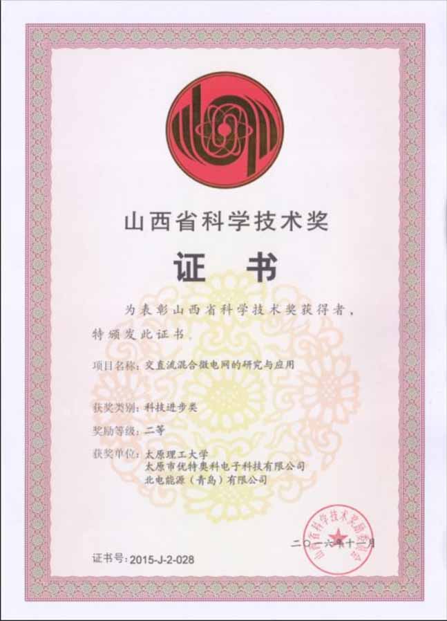 我公司與太原理工大學(xué)建立了長(zhǎng)期的產(chǎn)學(xué)研合作機(jī)制,合作完成了國家國際科技合作項(xiàng)目“含分布式電源的微電網(wǎng)運(yùn)行與優(yōu)化控制的合作研究”,其成果“交直流混合微電網(wǎng)的研究與應(yīng)用”經(jīng)山西省科技廳組織鑒定,專家意見為具有國際先進(jìn)技術(shù)水平。并獲得了2015年度山西省科技進(jìn)步二等獎(jiǎng)。