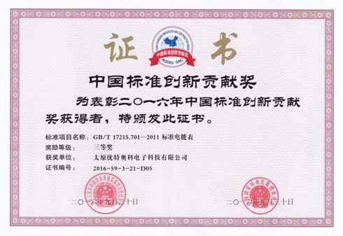 我公司作為國家標準《GB/T17215.701標準電能表》的主要起草單位獲得了2016年中國標準創(chuàng)新貢獻獎。